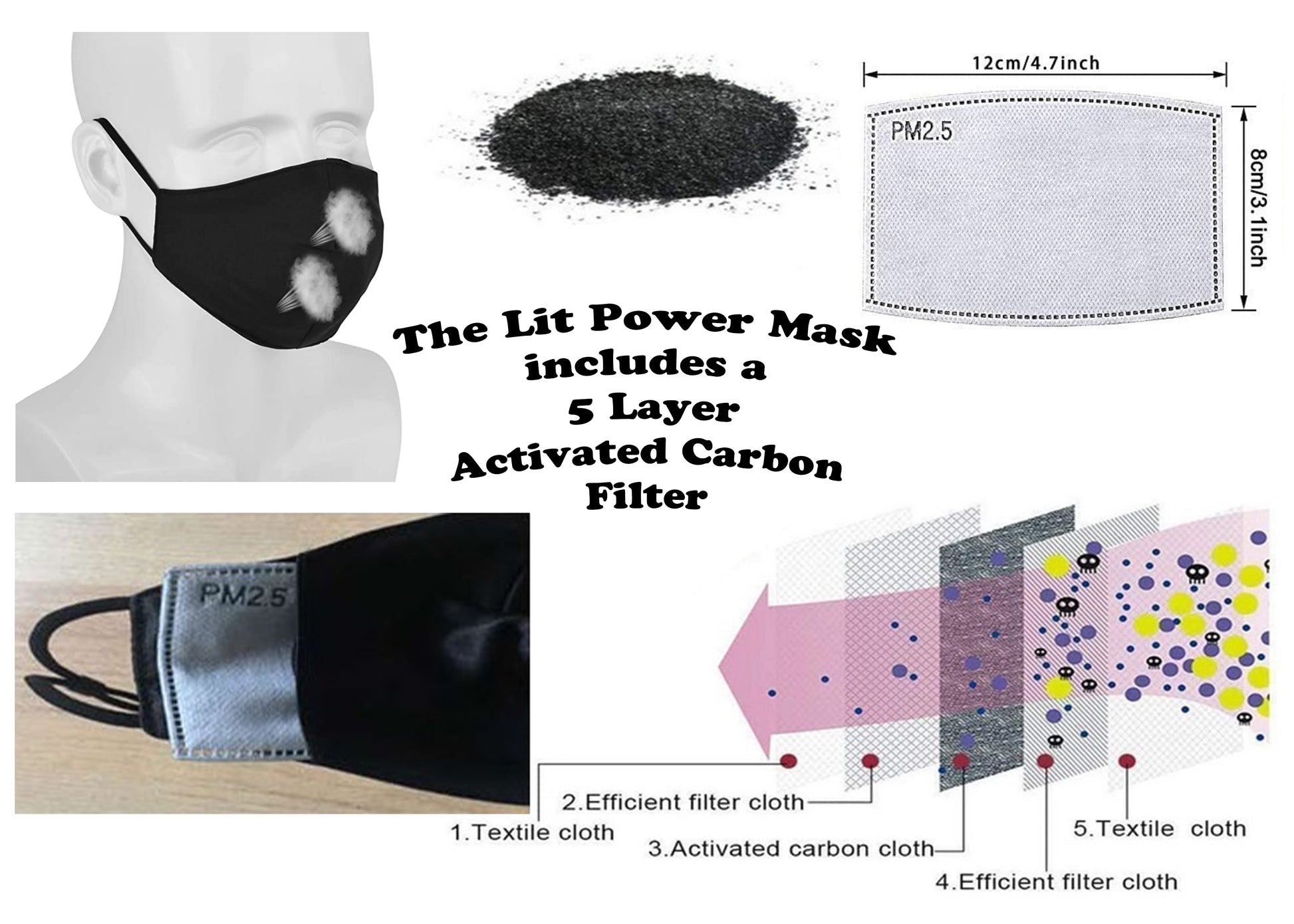 The Lit Power Mask Safety Feature Includes: A five Layer PM 2.5 Activated Carbon Filter Activated Carbon Filter stops the flow of airborne particles dust, smoke, ash, pollution, and pollen.