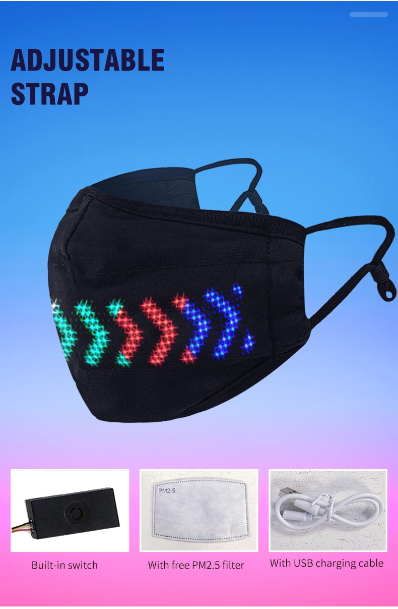 The Lit Power Mask allows you to send customize text, drawings and preinstalled animation to the 4 color or 1 solid color led display on the front of the mask via Bluetooth APP.